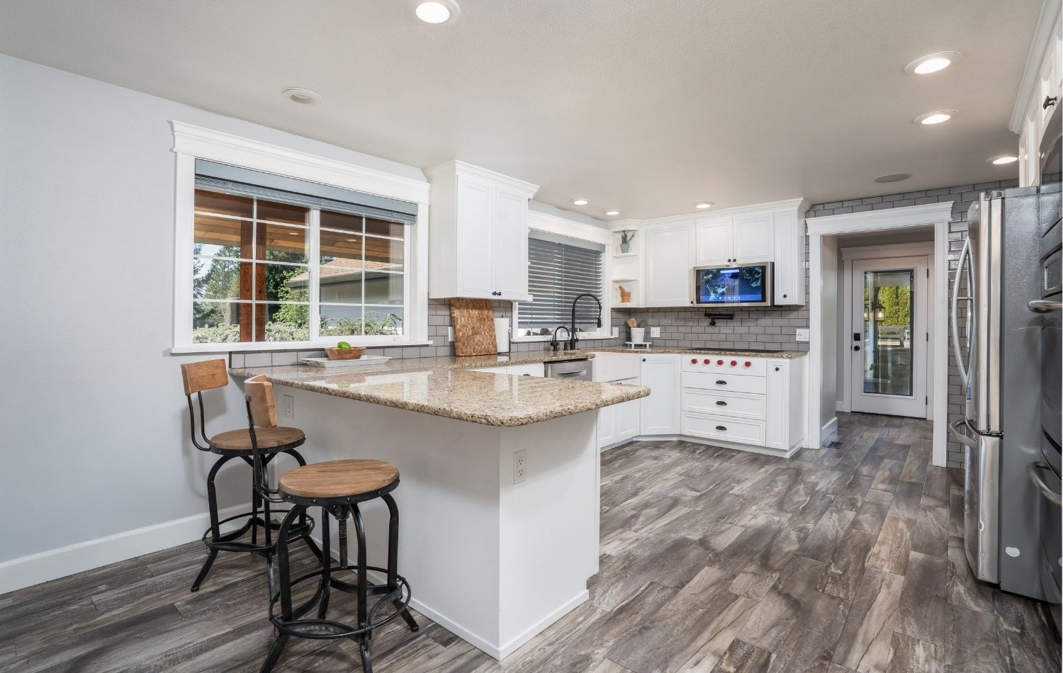 Discover open living and everyday comfort in the welcoming living room and dining area, and let everything from quiet evenings by the fireplace to lively parties unfold with ease. On-trend design meets top-notch efficiency in the chef’s kitchen, where standout features include high-end stainless steel appliances, granite countertops, ample storage in pristine cabinetry (don’t miss the eye-catching built-in shelving and windowed cabinet doors), and custom tile back splash.